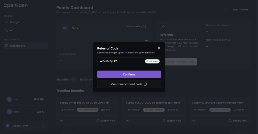 You can earn Bills (OpenEden’s pre-launch point system) by contributing liquidity to the OpenEden protocol. Bills can be earned by holding USDO, cUSDO, engaging with partner DeFi platforms, and referring others to the ecosystem.