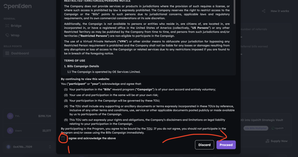 Go to https://portal.openeden.com/bills-campaign and connect your wallet. After connecting, you will be prompted to accept the Terms and Privacy Policy.