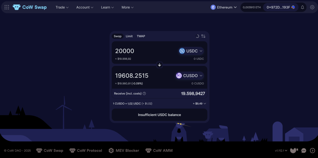 Link: https://swap.cow.fi/#/1/swap/0xA0b86991c6218b36c1d19D4a2e9Eb0cE3606eB48/CUSDO
