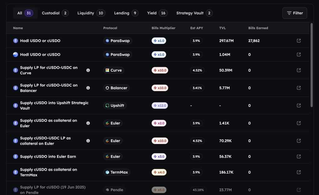 Simply holding USDO or cUSDO in your wallet gives you 1 bills per cUSDO per day. To maximize your rewards, use cUSDO in DeFi protocols to earn more points