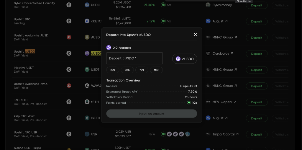 Go to https://app.upshift.finance/, connect your wallet, then select the Deposit menu. Find the “cUSDO” vault and deposit your cUSDO.