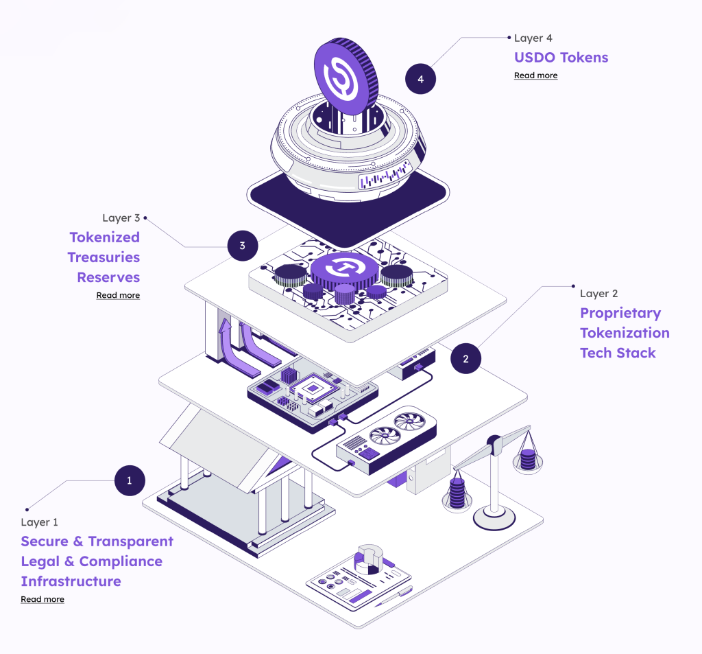 - Launch and backing: USDO launched Feb 21, 2025, as a U.S. dollar‑pegged stablecoin fully backed 1:1 by tokenized U.S. Treasuries via the TBILL vault.